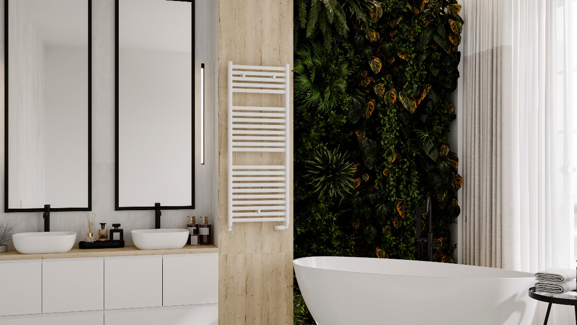 Grzejnik Luxrad Ares o wymiarach 1152×450 mm to idealny wybór dla tych, którzy cenią efektywność i estetykę. Oferując moc 552 W, skutecznie ogrzeje łazienkę, zapewniając przyjemną temperaturę. Stal niskowęglowa lakierowana proszkowo zapewnia długowieczność i odporność na korozję. Kolor czarny mat 9005 MAT idealnie wpisze się w różnorodne aranżacje wnętrz, a opcjonalnie istnieje możliwość personalizacji koloru z pełnej palety RAL. Konstrukcja profili: kolektory pionowe wykonane na profilu owalnym 30 x 50 mm, rury poziome okrągłe Ø 28 mm nadają nowoczesnego charakteru. Podłączenie typu ZBD znacząco ułatwia montaż. Produkt jest objęty 6-letnią gwarancją producenta.