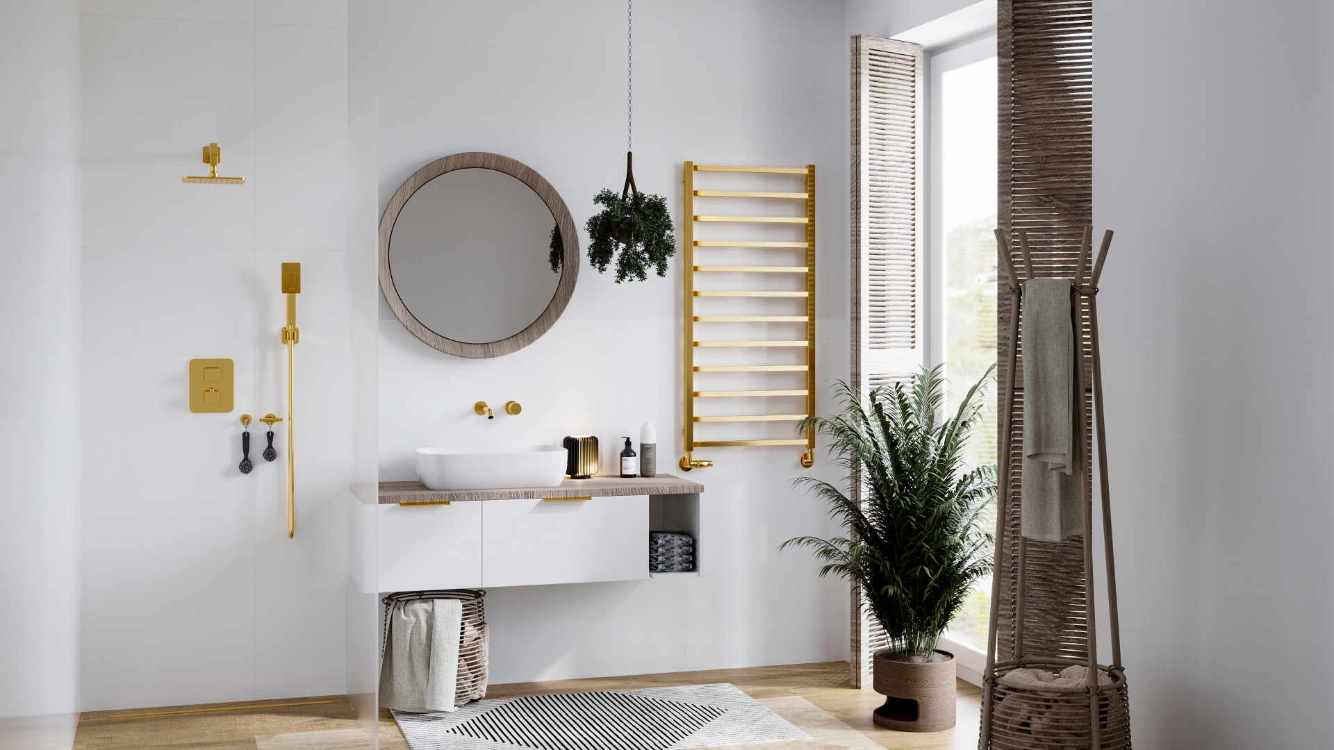 AURUM to seria grzejników, które wyznaczają nowe standardy estetyki. Wariant o wymiarach 1100×530 mm i mocy 275 W łączy szlachetny wygląd z funkcjonalnością. Podłączenie ZD, kwadratowe profile 20×20 mm oraz stal nierdzewna pokryta warstwą złota w technologii PVD sprawiają, że jest to produkt klasy premium. Idealny do wnętrz, gdzie liczy się detal – od stylu glamour po nowoczesne loftowe aranżacje. Dzięki technologii PVD grzejnik zachowuje piękny złoty połysk przez długie lata użytkowania.