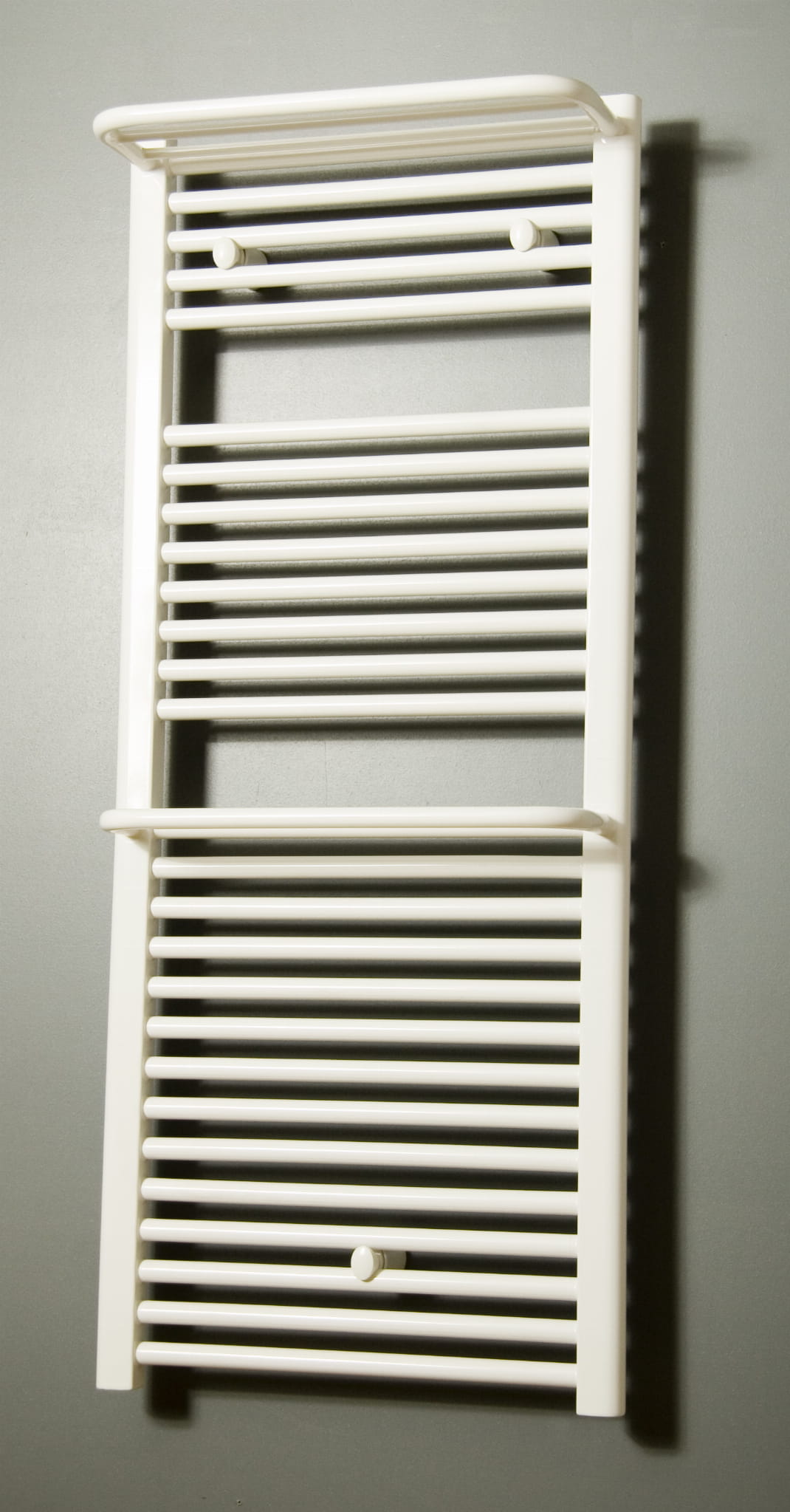 Grzejnik KILE to model, który spełnia kilka funkcji - grzeje i dekoruje pomieszczenie. Oprócz paneli grzewczych o okrągłym przekroju wspartych na dwóch smukłych kolektorach, grzejnik został wzbogacony o dodatkowe półki, które również grzeją. Za ich sprawą w łazience powstaje dużo dodatkowego miejsca na wieszanie i suszenie ręczników.