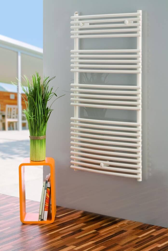 Cecha wyróżniająca grzejnik MERCURY to kształt. Jego konstrukcja w swej uniwersalności jest podobna do poprzedników, jednak to co w nim wyjątkowe, to zakrzywione, okrągłe rurki umieszczone na pionowych również zaokrąglonych kolektorach. To dodaje modelowi MERCURY szczególną elegancję i dyskretny charakter. Otwarta optyka daje też wystarczająco dużo miejsca na zawieszenie ręczników.