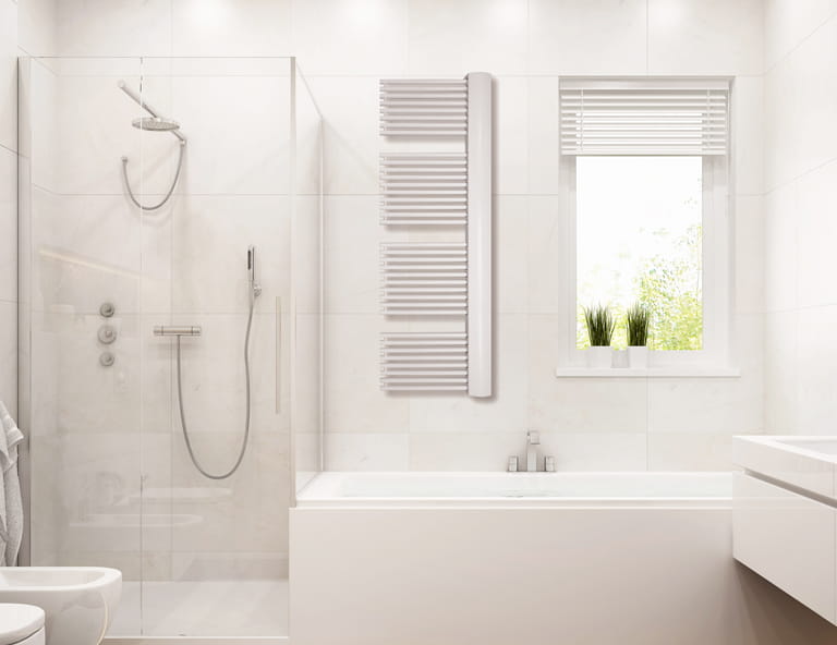 MODEL E z osłoną to grzejnik elegancki i prosty w formie. Podłużne poziome rurki o okrągłym przekroju zamontowane zostały na podwójnym kolektorze pionowym tylko z jednej strony, tworząc ciekawą kompozycję, która dopełni klasyczne wnętrze łazienki. Dodatkowo pionowe kolektory zostały osłonięte.