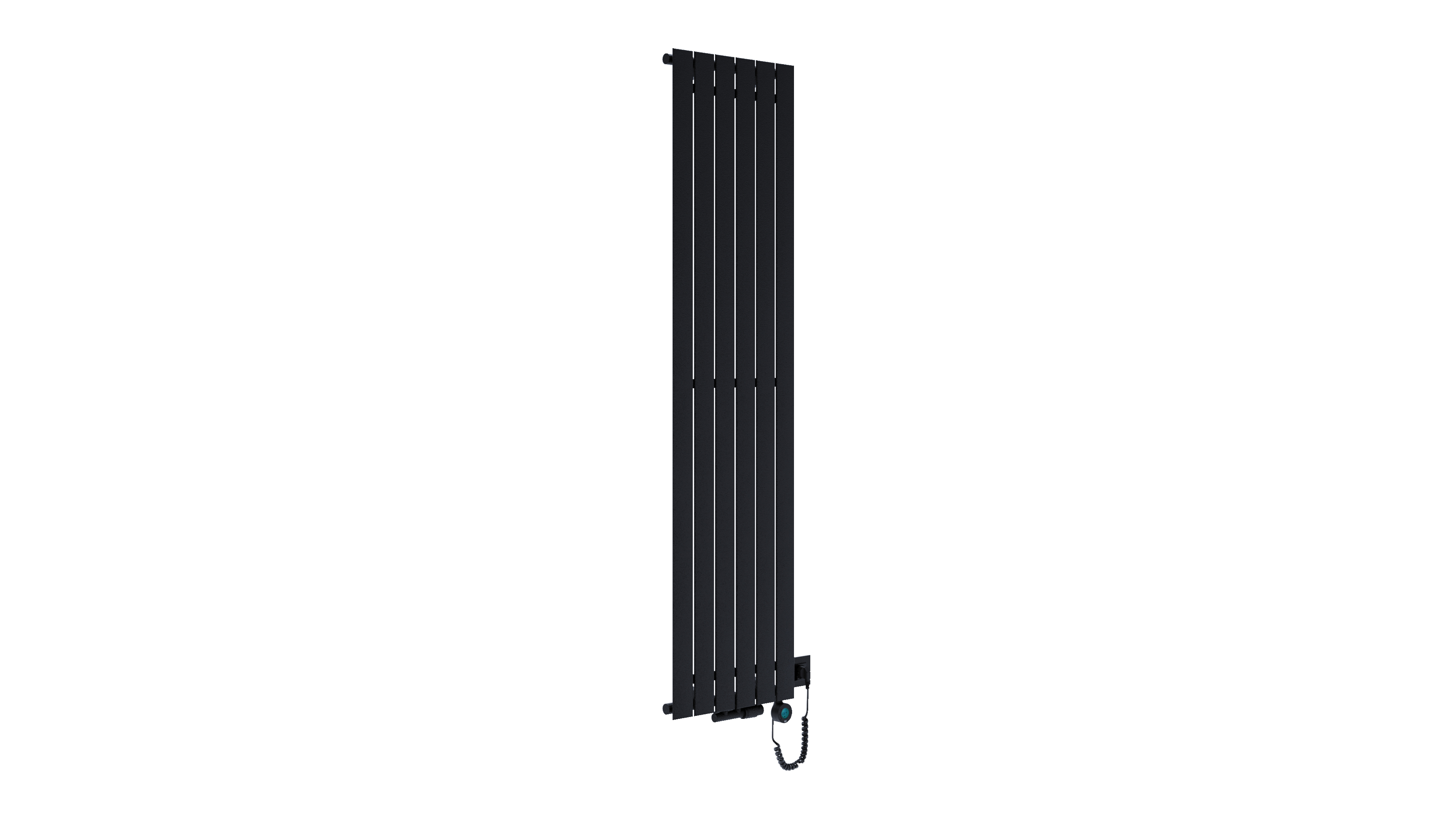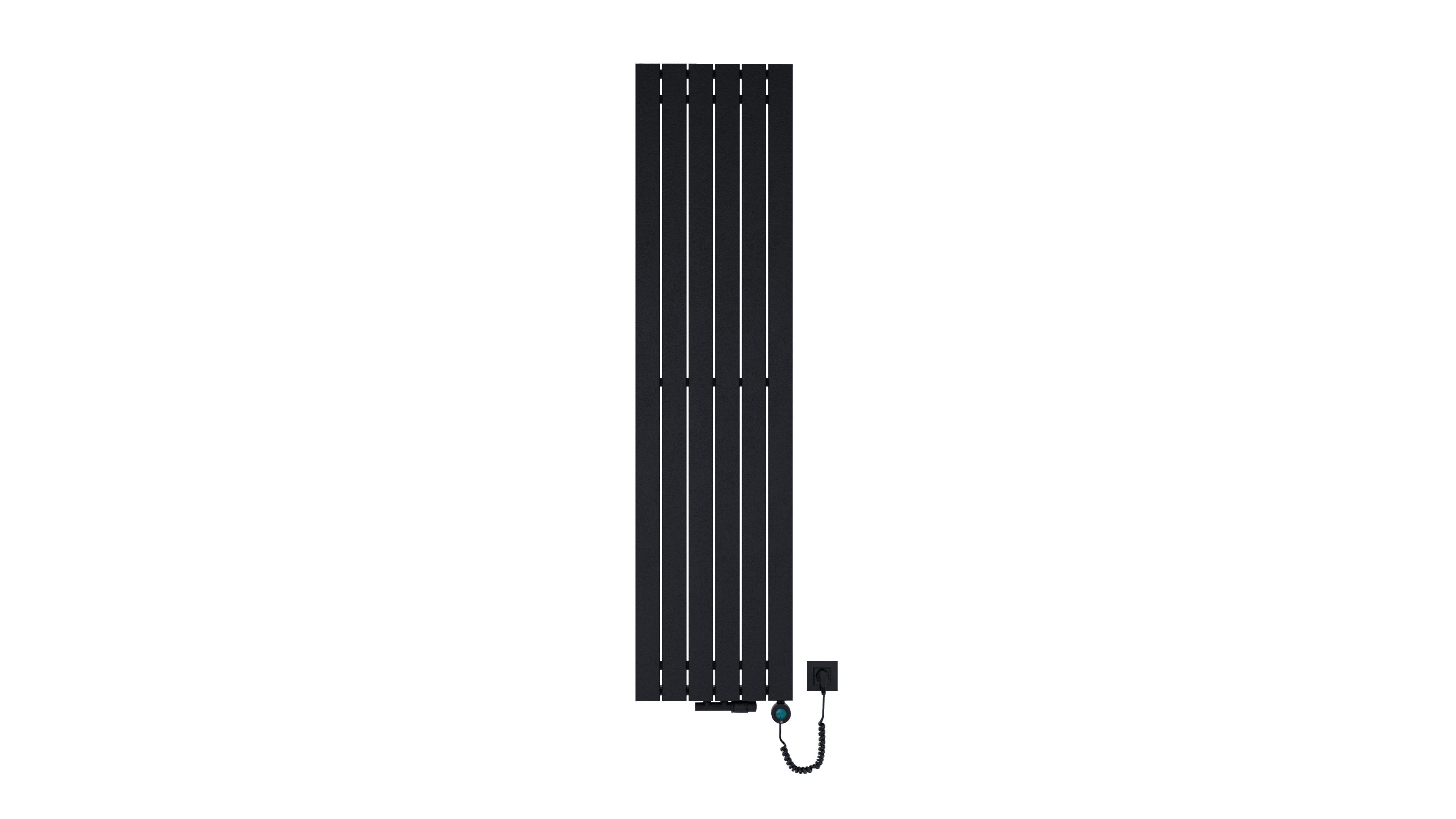 Grzejnik łazienkowy Luxrad Solis o wymiarach 1800×445 mm, w kolorze czarny mat str., z mocą 600 W i podłączeniem dolnym centralnym/P. Efektywność cieplna w połączeniu z estetyką wykonania.