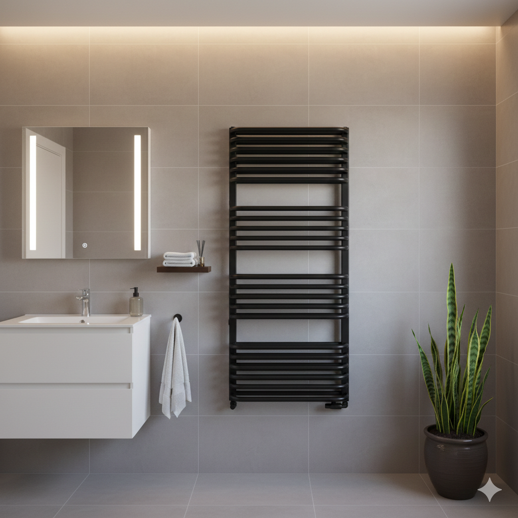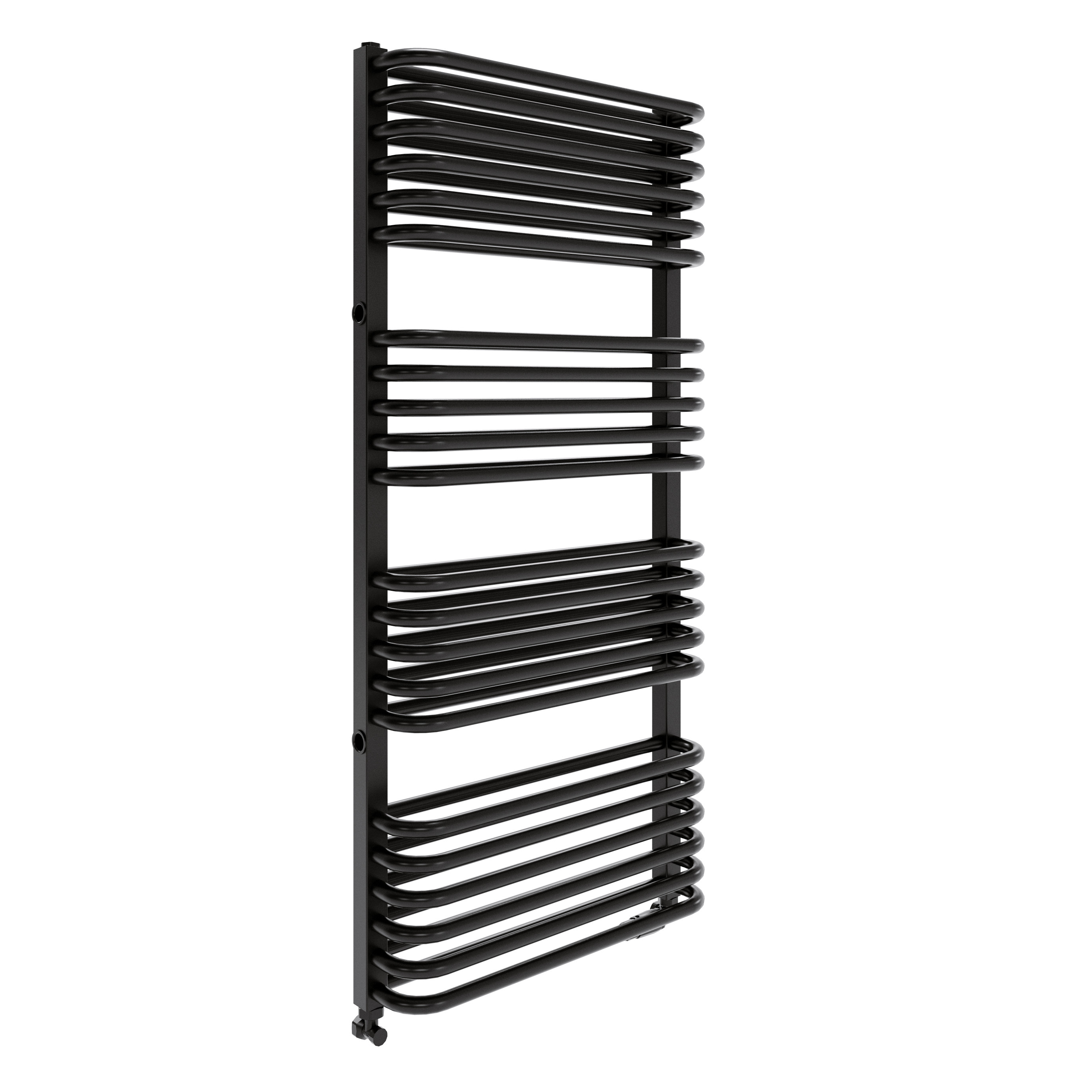 Grzejnik łazienkowy Luxrad Stark 112 x 53 cm w kolorze czarny mat struktura to praktyczne rozwiązanie do Twojej łazienki. Wyróżnia się nowoczesnym, matowym wykończeniem oraz kompaktową budową, dzięki czemu oszczędza miejsce nawet w mniejszych wnętrzach. Stal niskowęglowa zapewnia odporność na korozję i uszkodzenia, gwarantując trwałość na lata. Produkt łatwo dopasujesz do większości aranżacji i systemów centralnego ogrzewania.