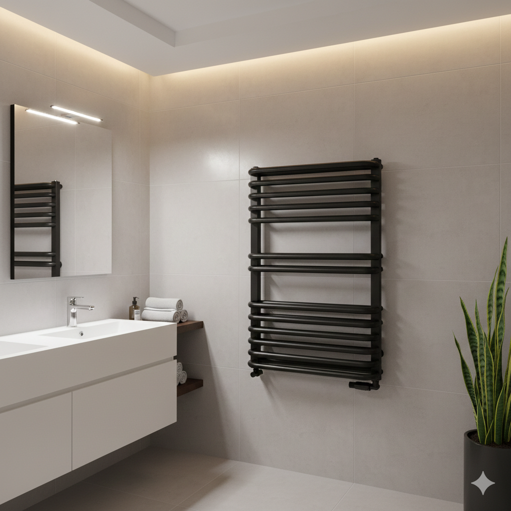 Grzejnik łazienkowy Luxrad Stark 64x53 cm czarny mat struktura ZBD 516W to nowoczesne i stylowe rozwiązanie do każdego wnętrza, które łączy funkcjonalność z eleganckim designem. Jego atrakcyjny czarny mat doskonale komponuje się w różnorodnych aranżacjach, stanowiąc nie tylko źródło ciepła, ale również element dekoracyjny.