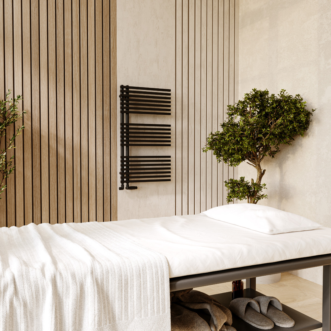 Grzejnik Luxrad Typ E o wymiarach 1179×500 mm to funkcjonalne i estetyczne rozwiązanie do łazienki. Dzięki mocy 553 W zapewnia skuteczne ogrzewanie i komfort termiczny. Wykonany ze stali niskowęglowej lakierowanej proszkowo, oferuje trwałość i odporność na korozję. Kolor czarny mat 9005 MAT wpasuje się w wiele aranżacji, a dodatkowo istnieje możliwość wyboru innej barwy z pełnej palety RAL. Konstrukcja oparta na kolektorach pionowych okrągłe Ø 30 mm oraz rurach poziomych kwadratowe 20 x 20 mm zapewnia nowoczesny wygląd. Podłączenie typu ZDL/ZDP sprawia, że montaż jest szybki i prosty. Produkt objęty jest 6-letnią gwarancją.