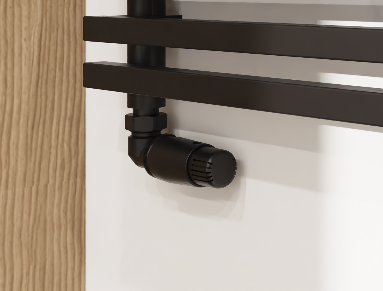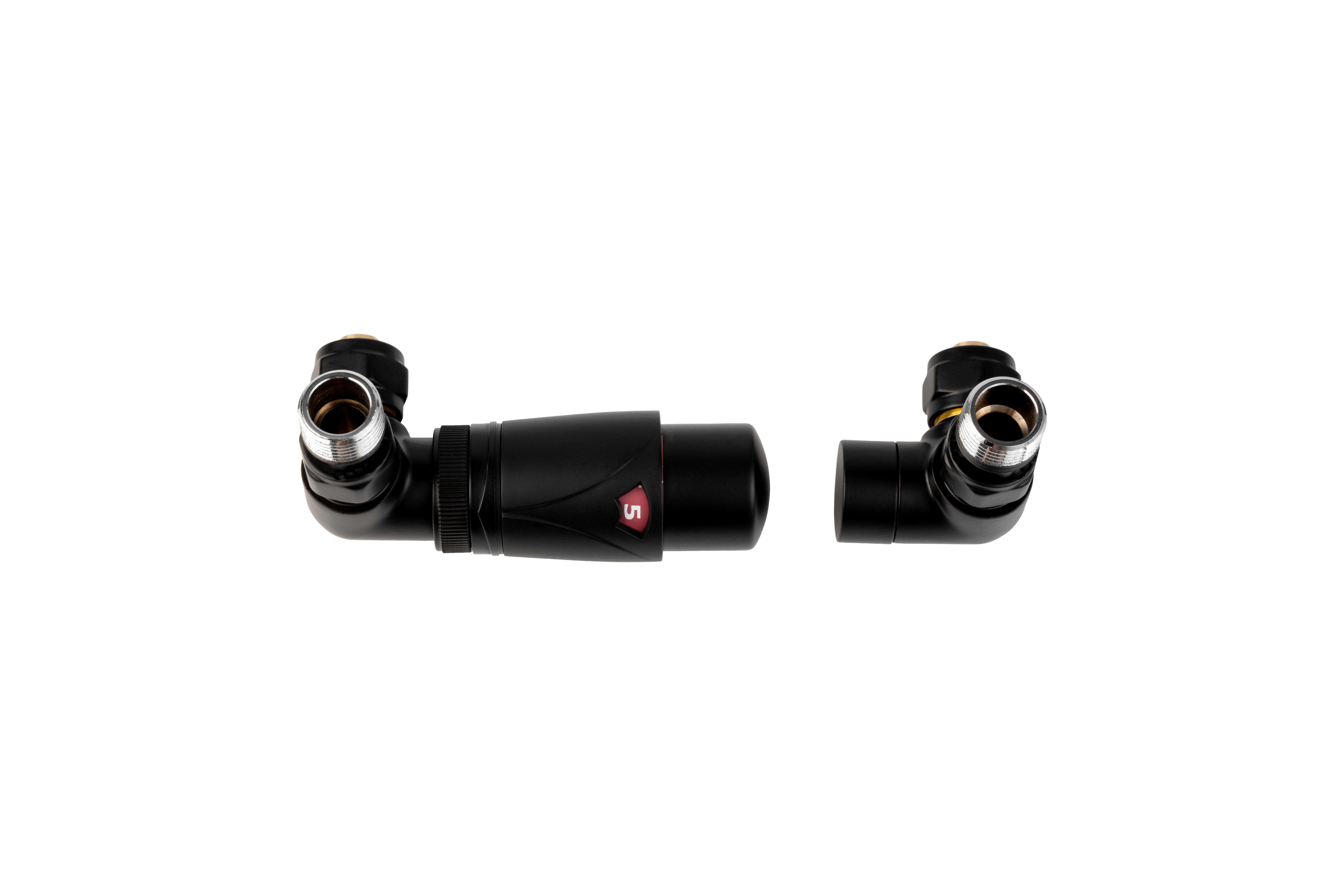 Stylowy, czarny matowy zawór termostatyczny osiowy uniwersalny do nowoczesnych wnętrz. Zawiera komplet złączek PEX i półśrubunków. Pozwala na wygodną regulację temperatury i montaż w figurze lewej lub prawej. Kompatybilny z głowicami M30x1,5.