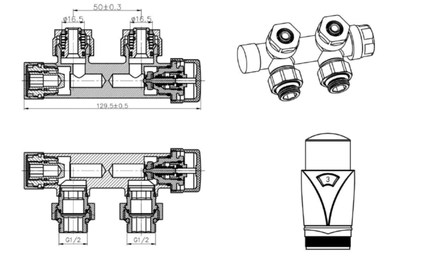 • Do grzejnika: ½”, instalacja: PEX 16 mm